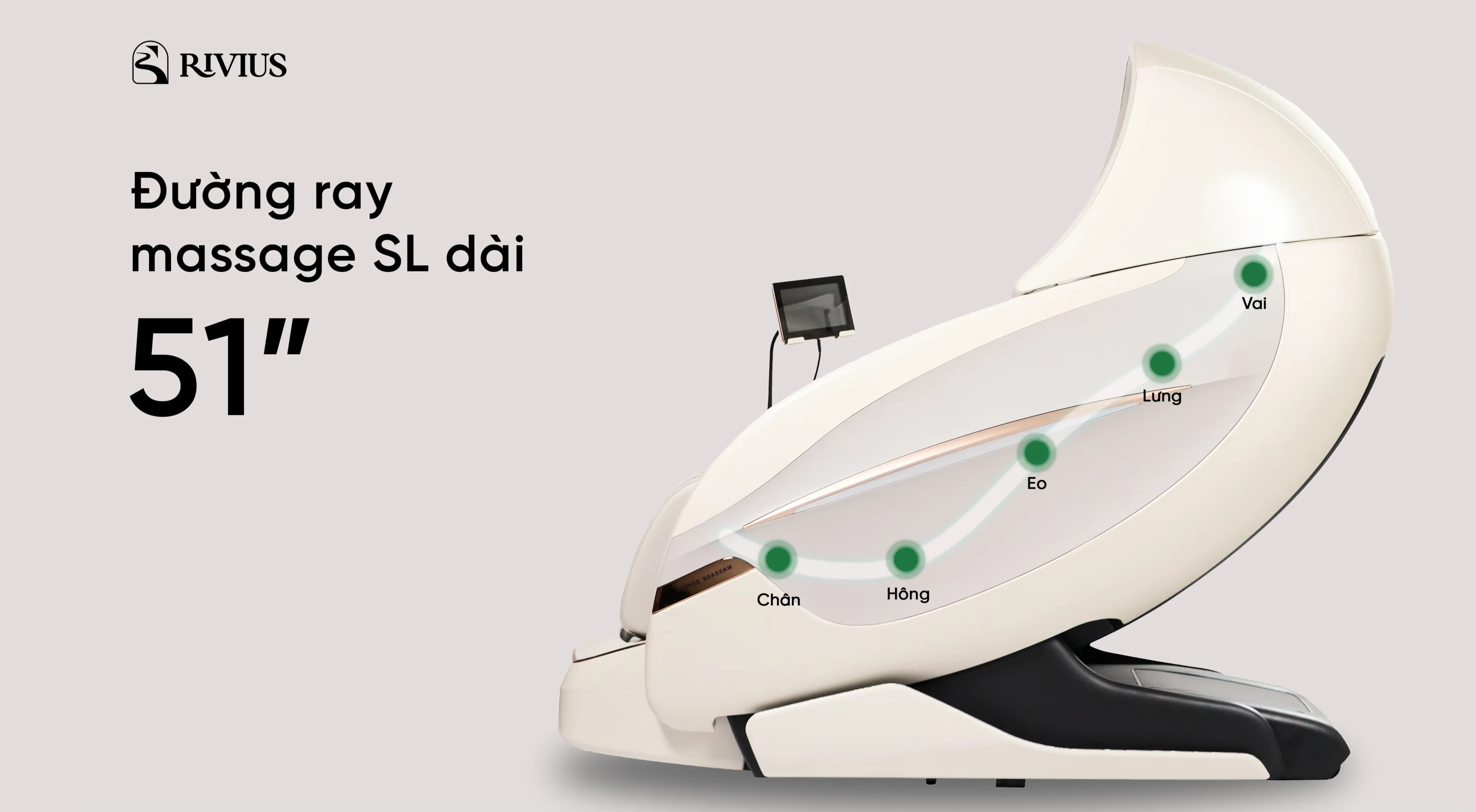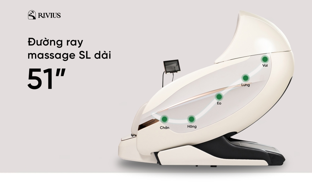 Ghế massage Rivius sở hữu hệ thống đường ray massage SL dài 51", mang đến trải nghiệm massage toàn thân vượt trội. Được thiết kế để theo dõi và tác động chính xác vào các điểm cơ thể quan trọng, không chỉ giúp thư giãn mà còn cải thiện sức khỏe một cách hiệu quả.