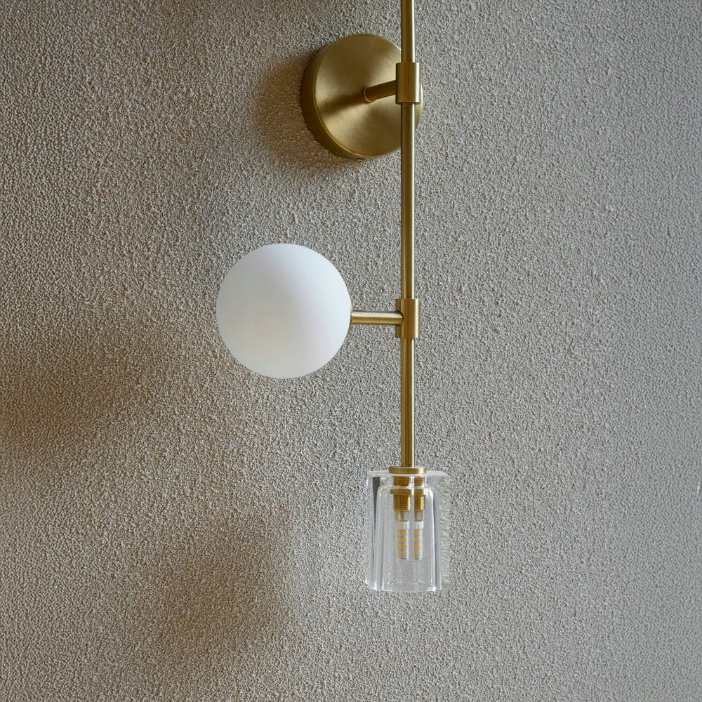 Chất liệu và hoàn thiện cao cấp: Thân đèn kim loại hoàn thiện màu đồng xước, kết hợp cùng thủy tinh trong suốt và cầu thủy tinh đục mờ, mang đến cảm giác thanh thoát và sang trọng.