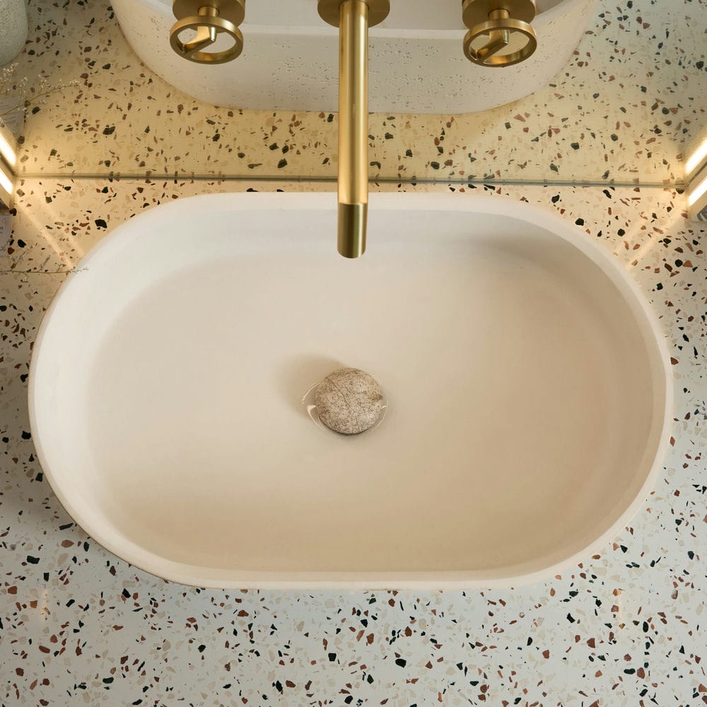 Lavabo Elna dễ dàng kết hợp cùng vòi gắn tường mạ vàng, mặt bàn terrazzo và hệ gương soi khổ lớn, mang lại tổng thể sang trọng nhưng gần gũi – lý tưởng cho căn hộ phong cách Japandi, Scandinavian hoặc Modern Luxe.