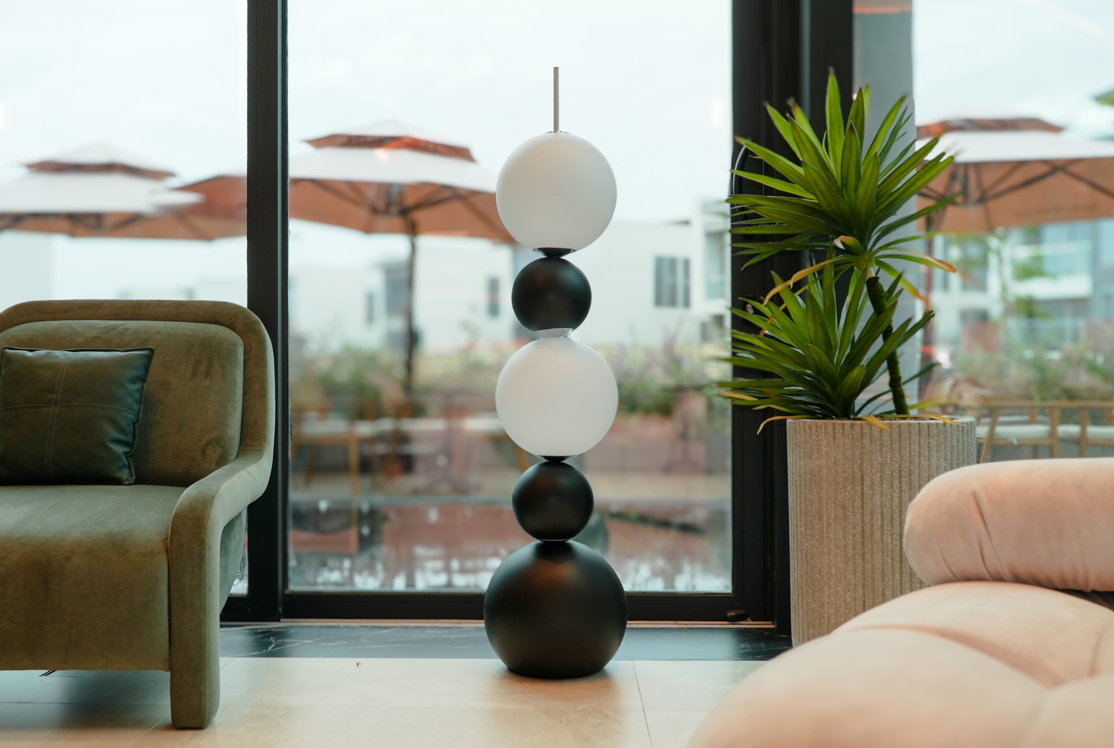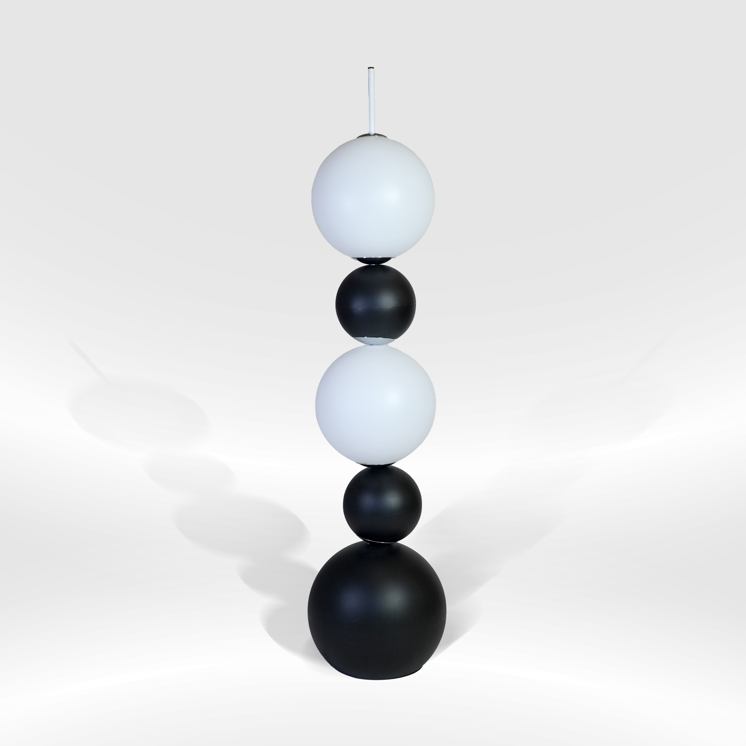 Rivius Orbivra là sự kết hợp hoàn hảo giữa thiết kế hình học tối giản và nghệ thuật thị giác, mang đến một sản phẩm không chỉ là đèn chiếu sáng mà còn là một tác phẩm nghệ thuật đầy cuốn hút. Với cấu trúc 5 khối cầu xếp chồng xen kẽ màu đen mờ và trắng mờ, Rivius Orbivra tạo nên một hình khối đối xứng nhưng mềm mại, khiến bất kỳ không gian nào cũng trở nên nổi bật.