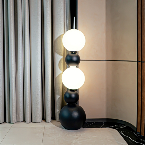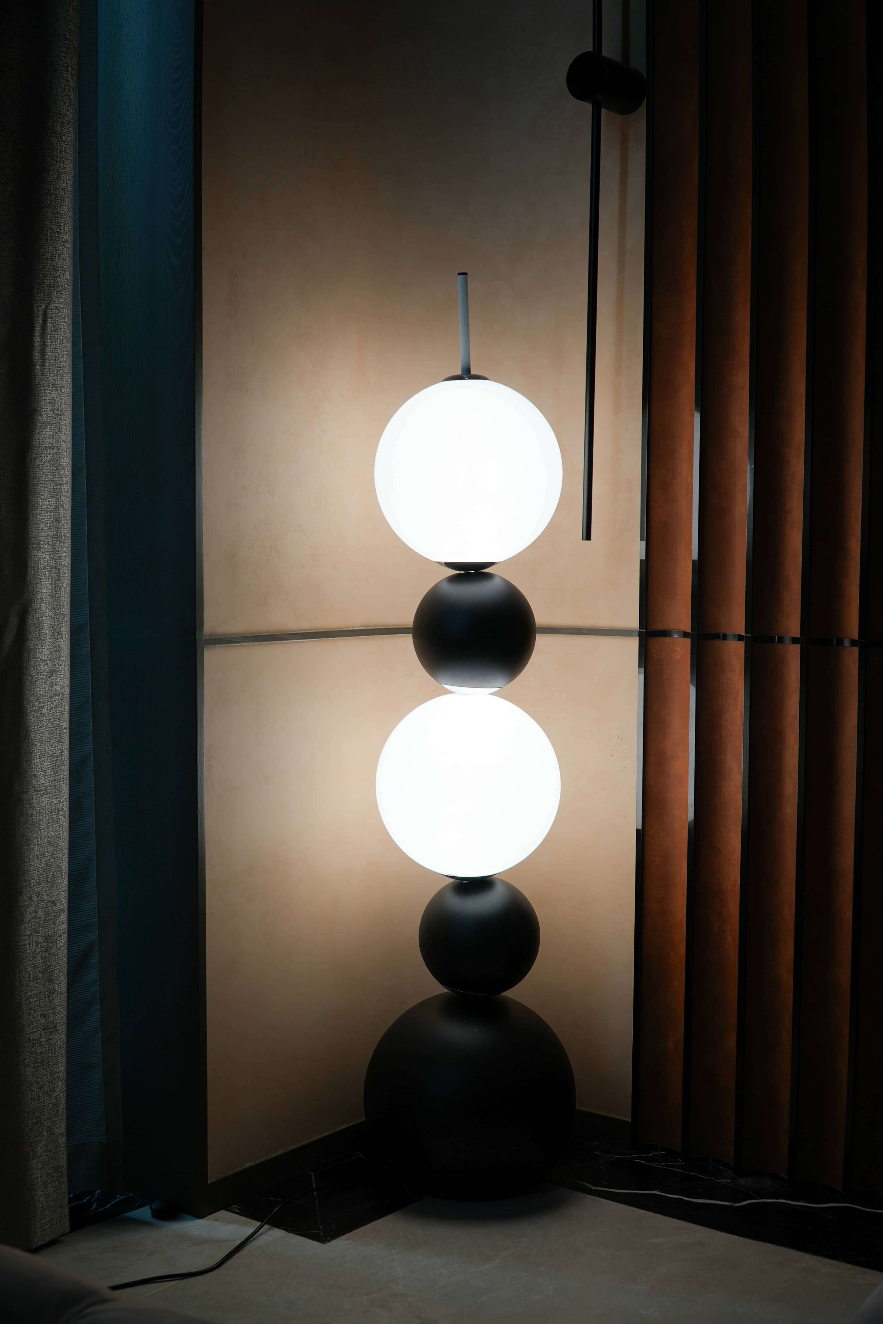 Ánh sáng khuếch tán: Hai khối cầu trắng phát ra ánh sáng dịu nhẹ, tạo ra bầu không khí ấm áp và thư giãn. Đèn mang đến sự thoải mái cho mắt và phù hợp với không gian hiện đại.