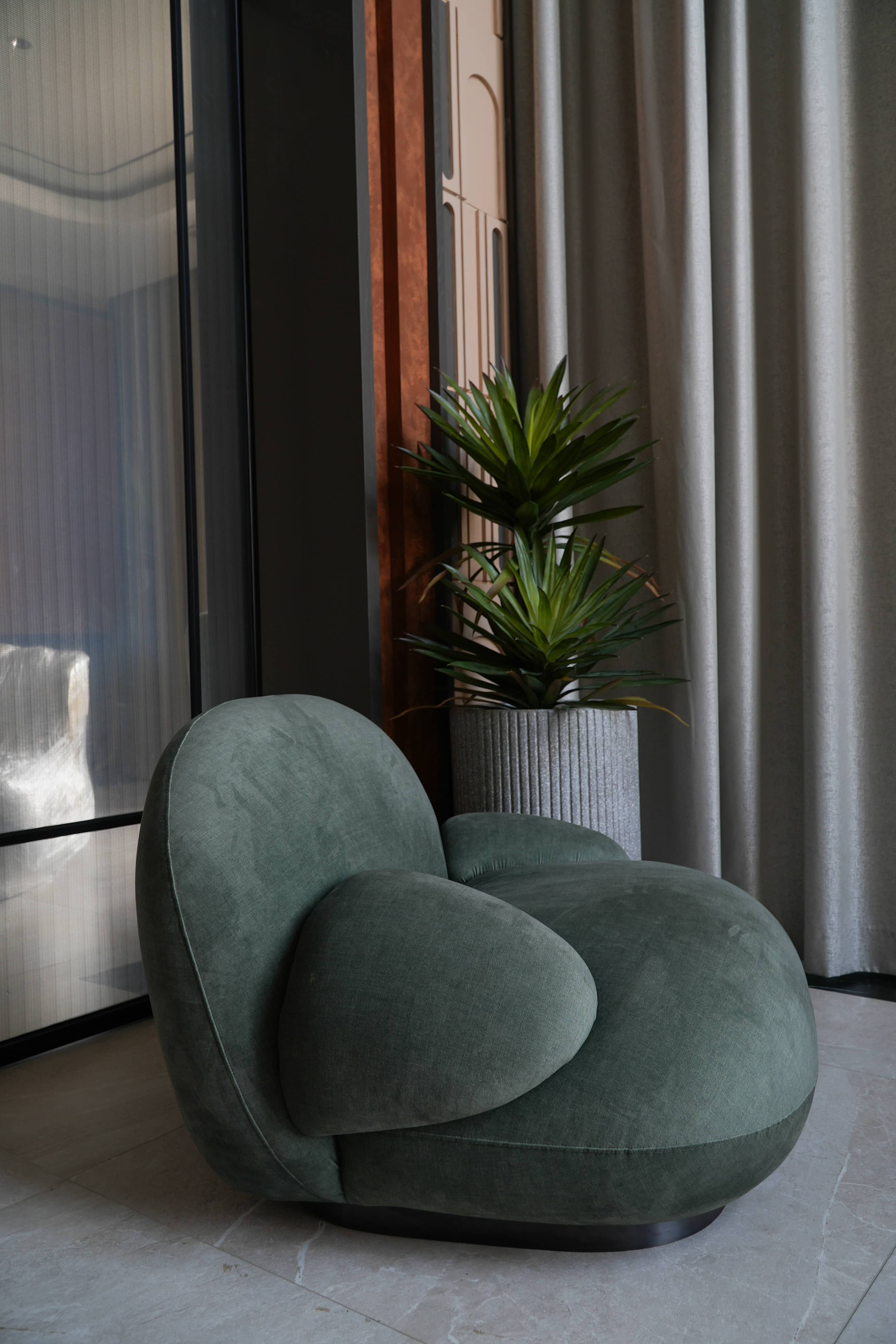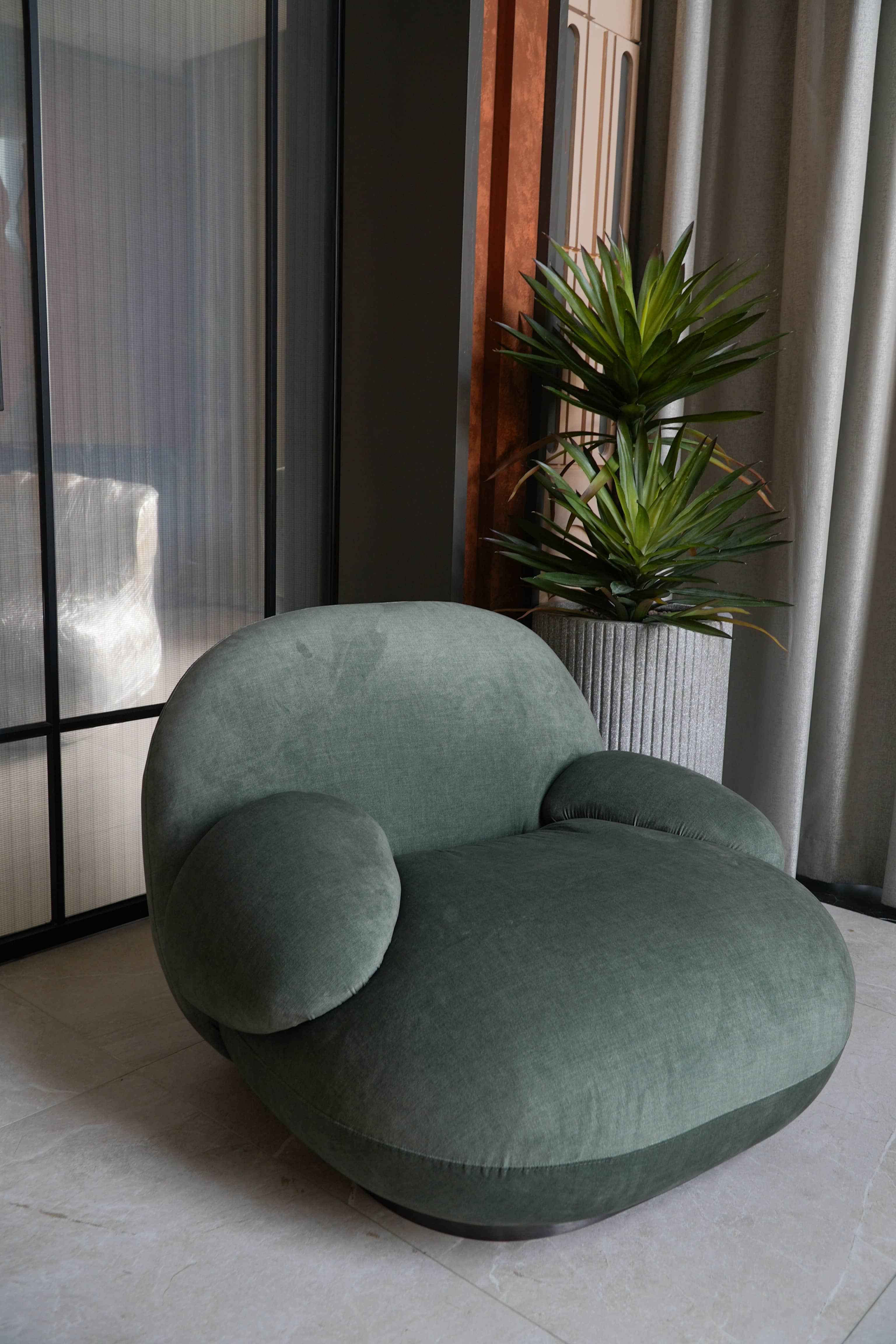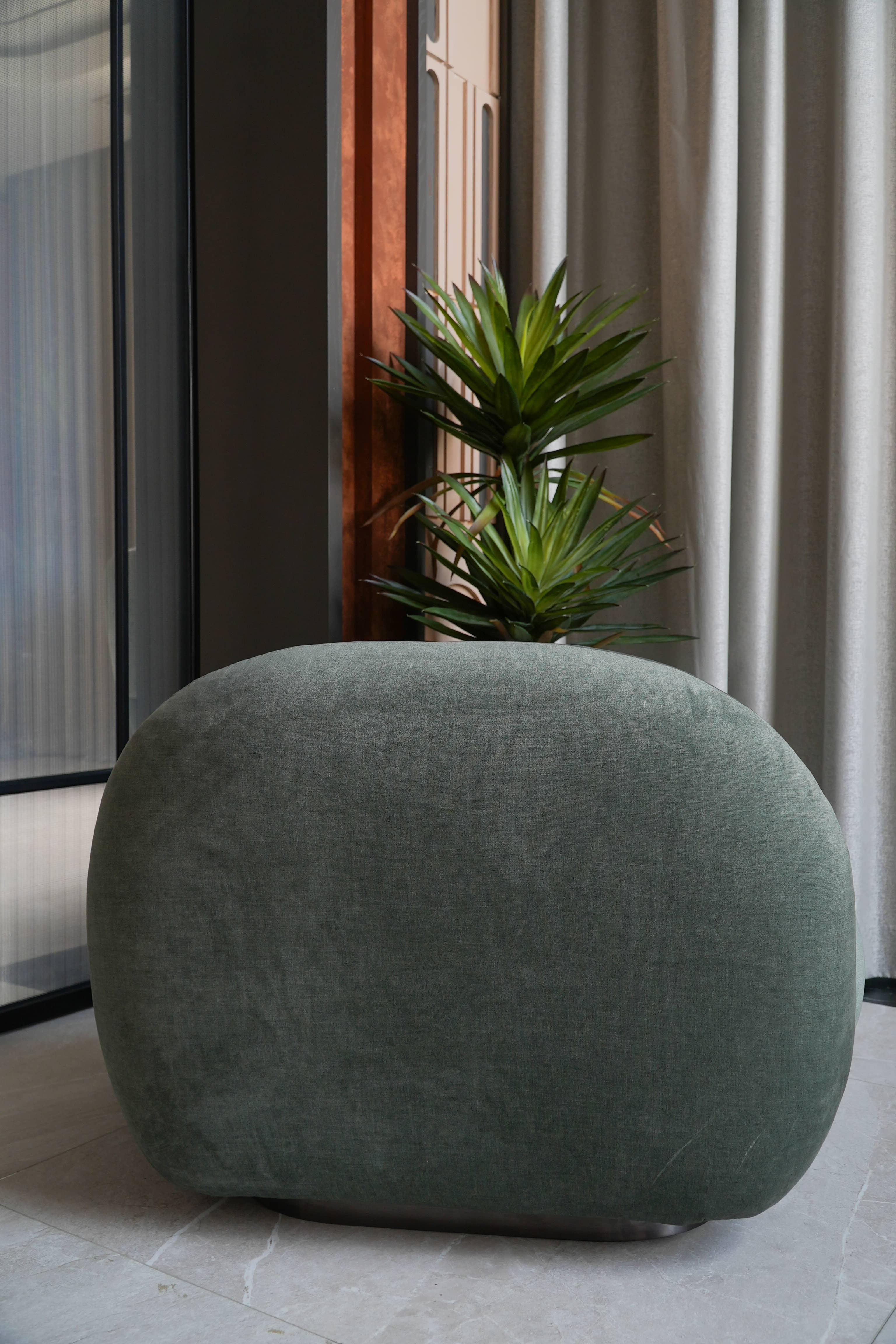 Rivius Overa là chiếc ghế của sự thoải mái tối đa và thẩm mỹ tối giản đương đại. Với các đường cong liền mạch, thiết kế không chân lộ và tỷ lệ phóng đại đầy táo bạo, ghế Overa mang lại trải nghiệm ngồi như được ôm trọn trong một đám mây. Tay vịn và tựa lưng được tích hợp thành một thể thống nhất, nâng đỡ cơ thể nhẹ nhàng. Lớp vải phủ màu xanh xám trung tính tăng thêm chiều sâu thị giác và dễ dàng hòa hợp với các không gian mang tính nghệ thuật hoặc thiết kế đương đại.