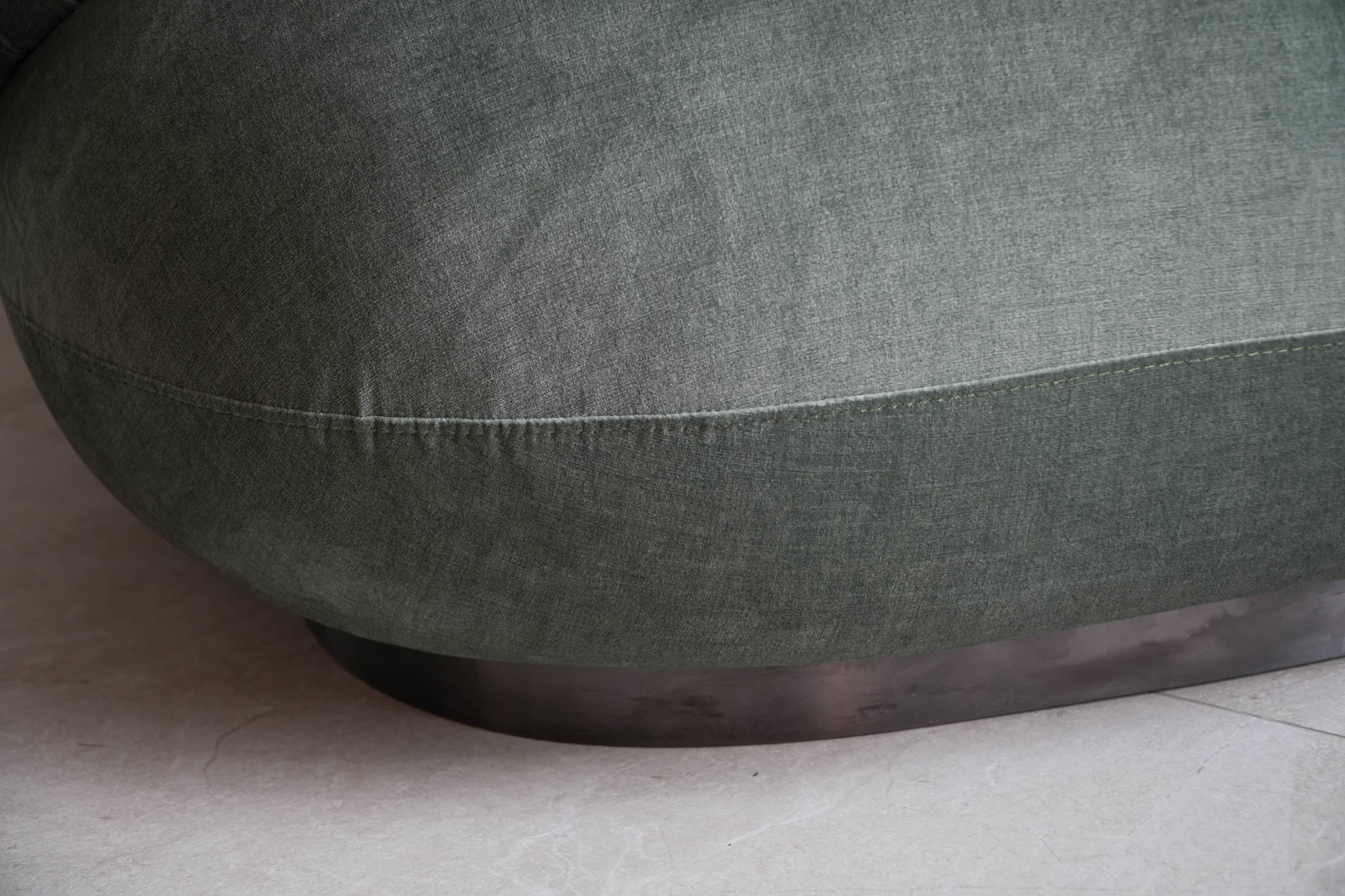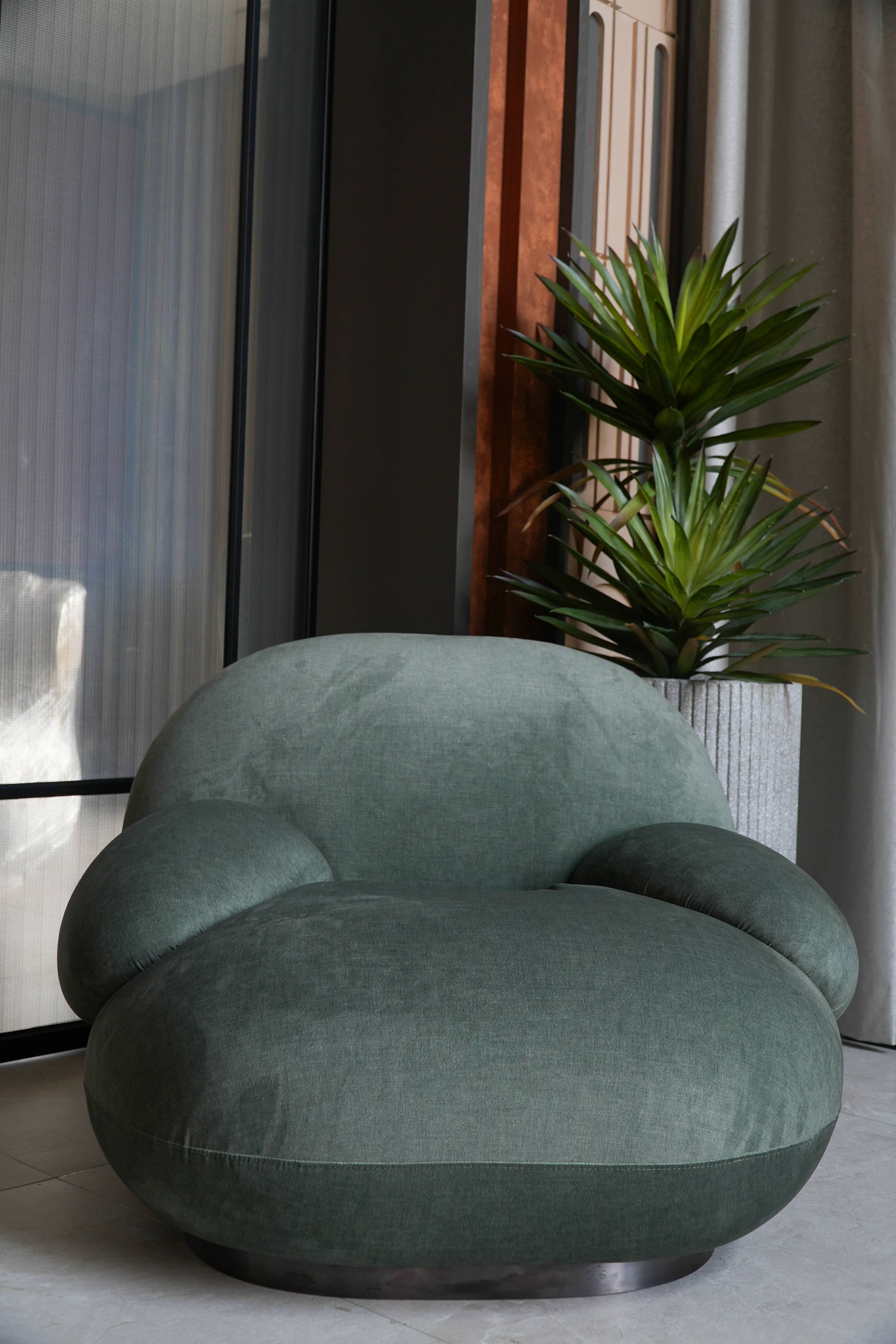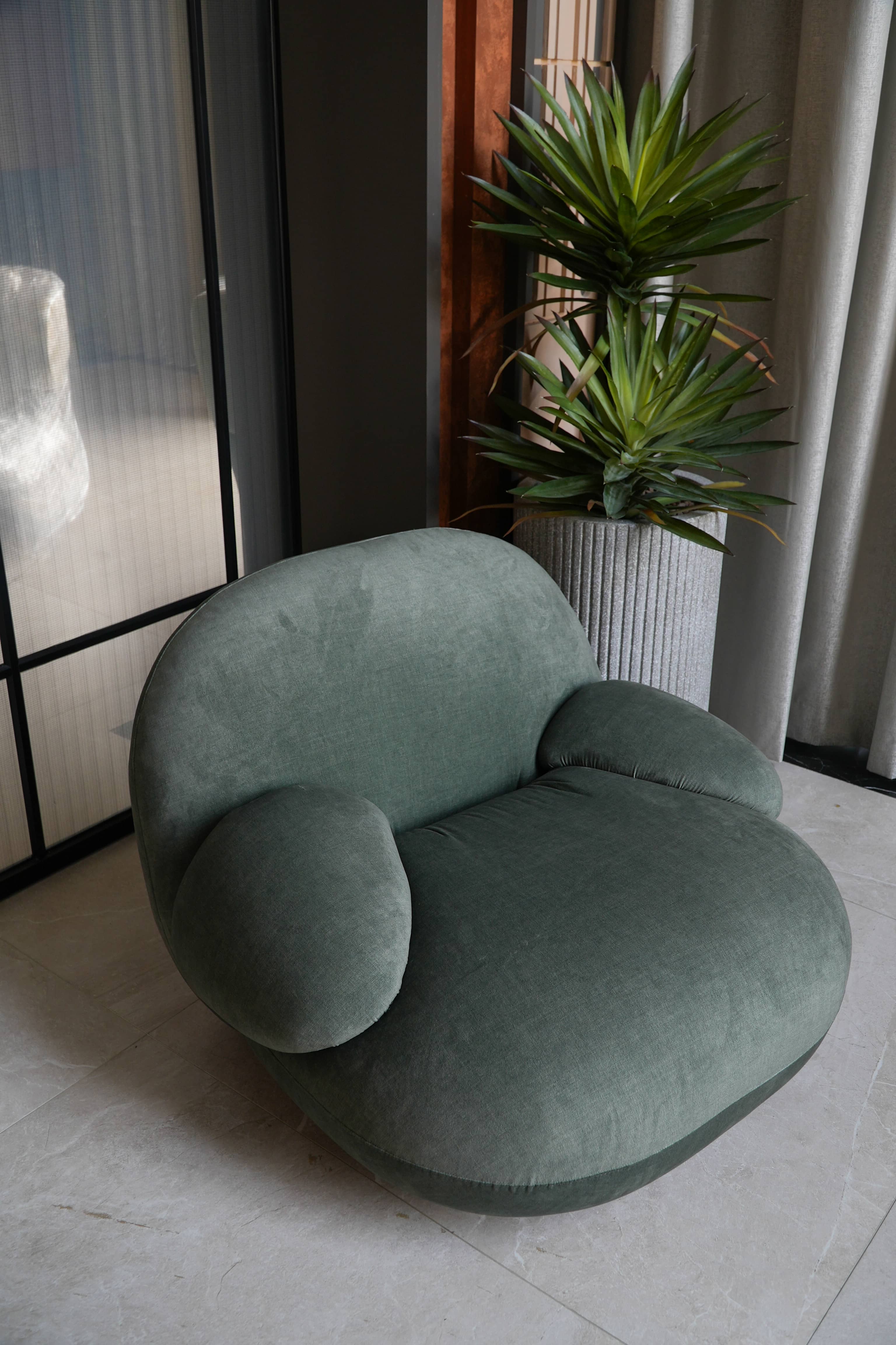 Rivius Overa là chiếc ghế của sự thoải mái tối đa và thẩm mỹ tối giản đương đại. Với các đường cong liền mạch, thiết kế không chân lộ và tỷ lệ phóng đại đầy táo bạo, ghế Overa mang lại trải nghiệm ngồi như được ôm trọn trong một đám mây. Tay vịn và tựa lưng được tích hợp thành một thể thống nhất, nâng đỡ cơ thể nhẹ nhàng. Lớp vải phủ màu xanh xám trung tính tăng thêm chiều sâu thị giác và dễ dàng hòa hợp với các không gian mang tính nghệ thuật hoặc thiết kế đương đại.