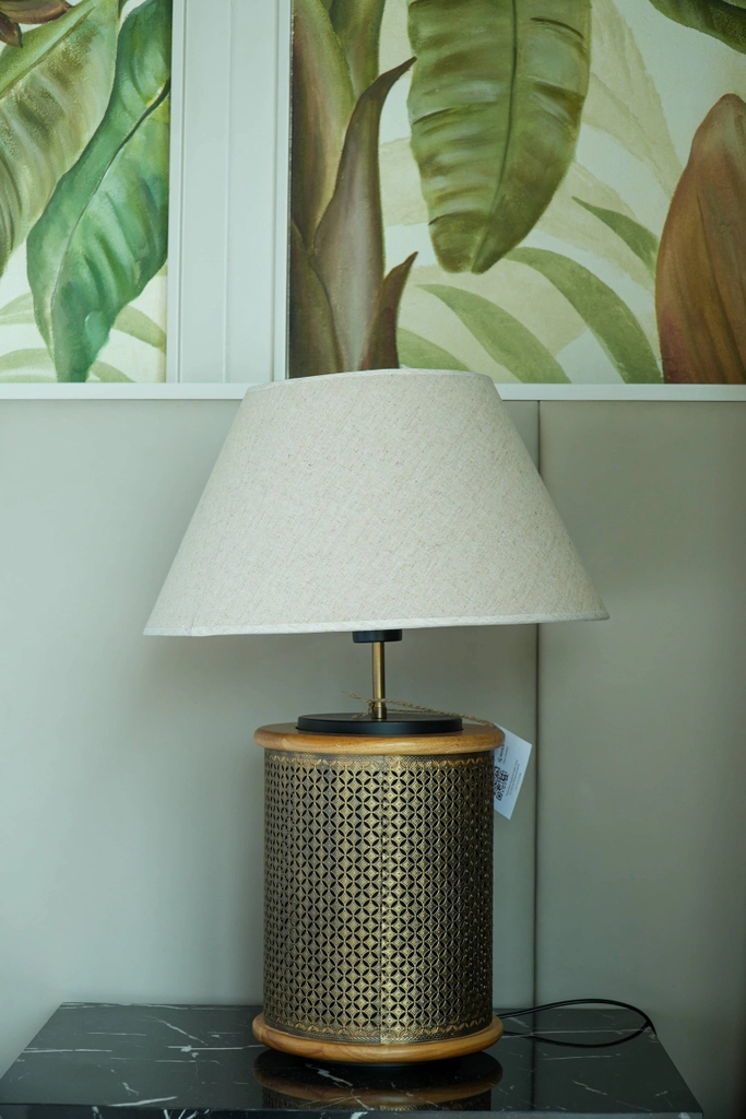 | Chất liệu | Thân đèn: gỗ tự nhiên + lưới kim loại hoa văn + mây đan; Chụp đèn: vải be/kem |