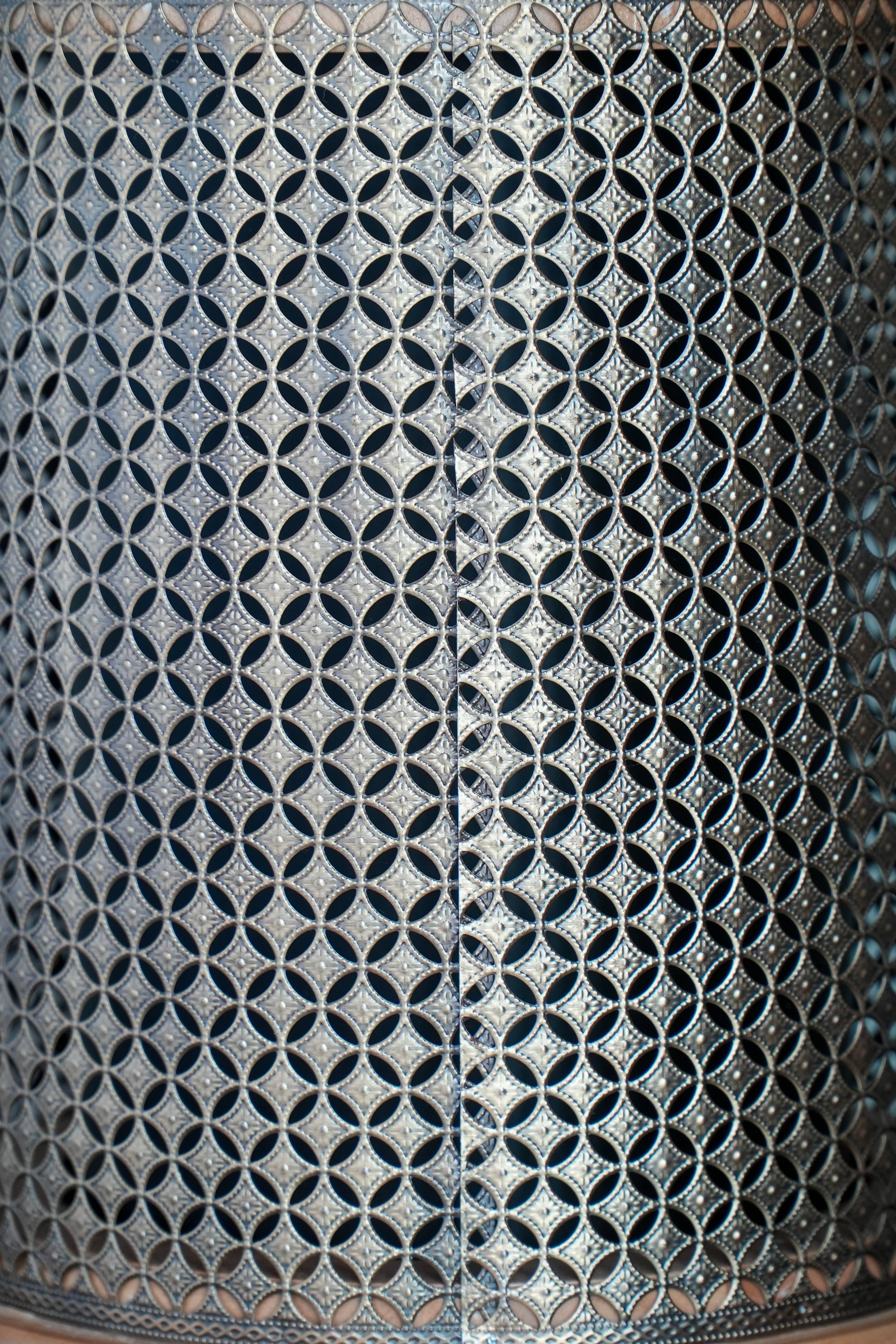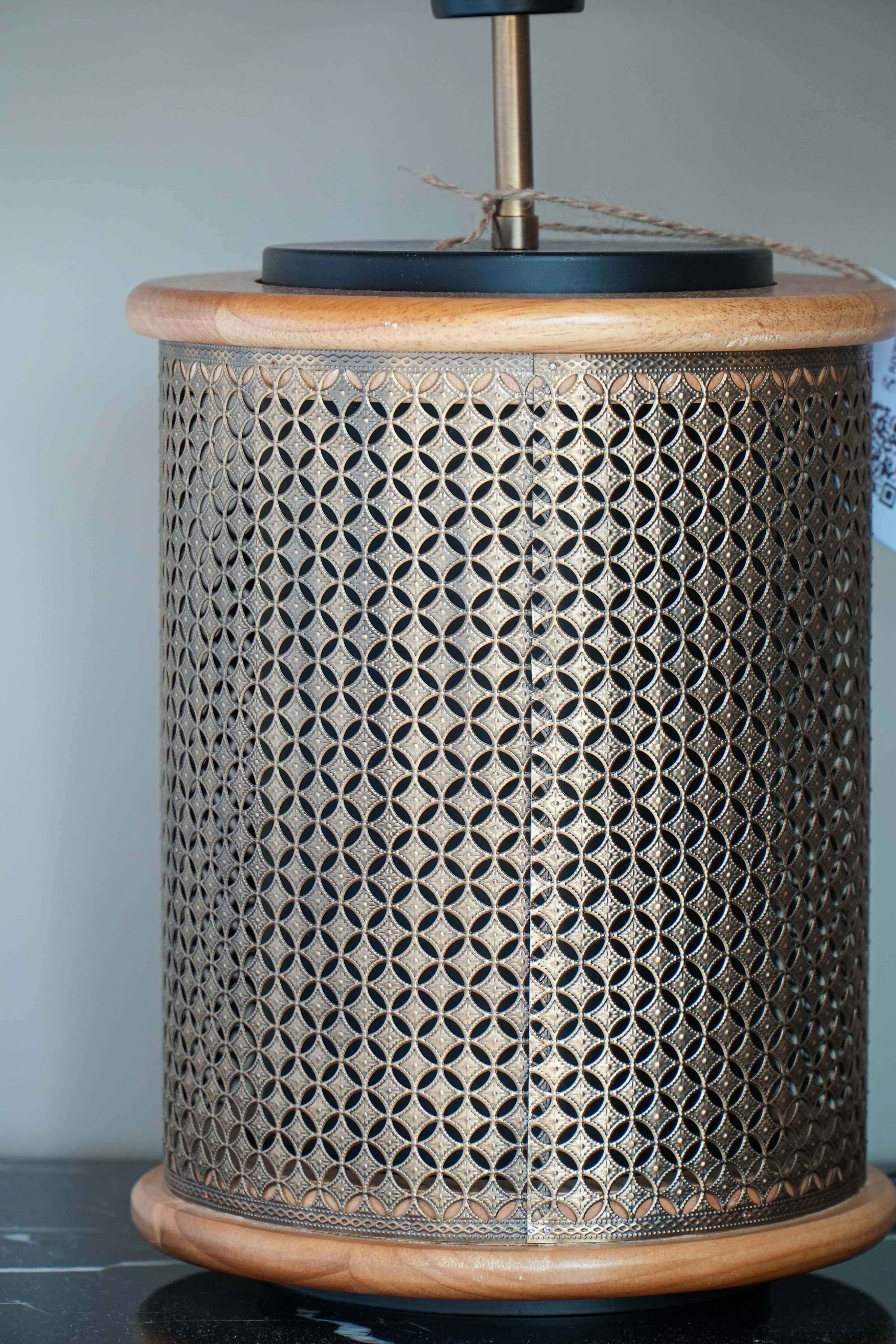 Thân đèn đa chất liệu: gỗ – kim loại hoa văn – mây đan bên trong.