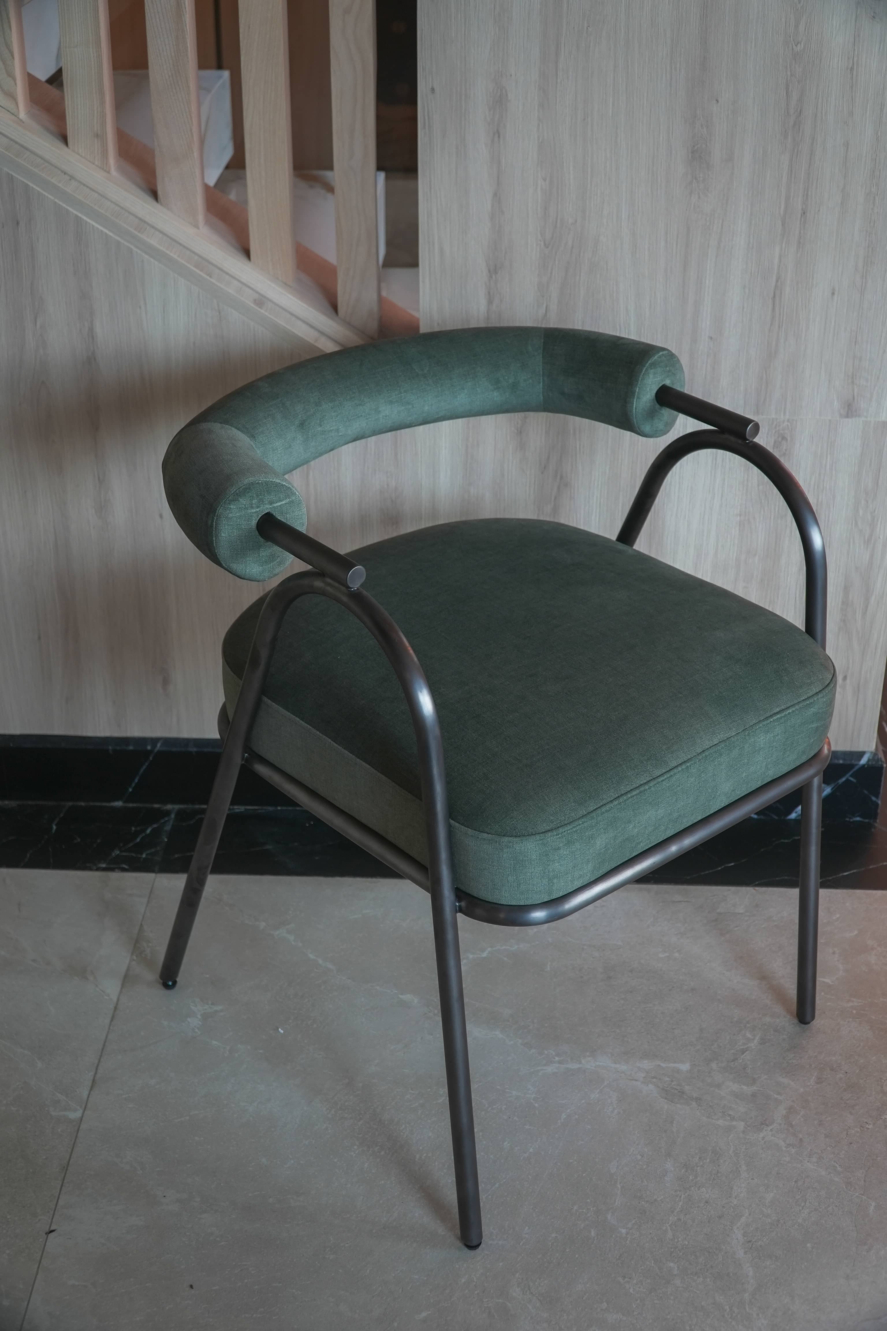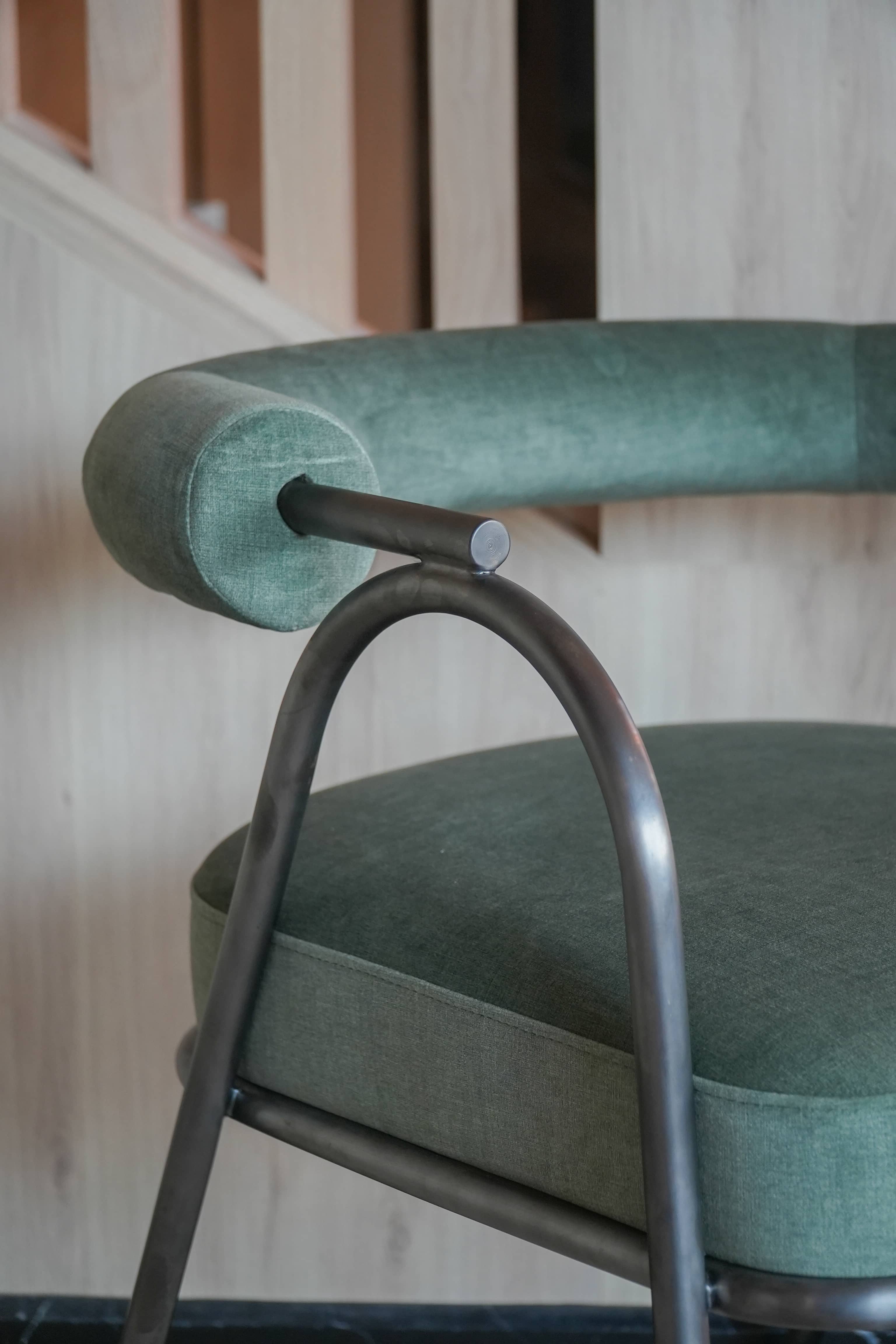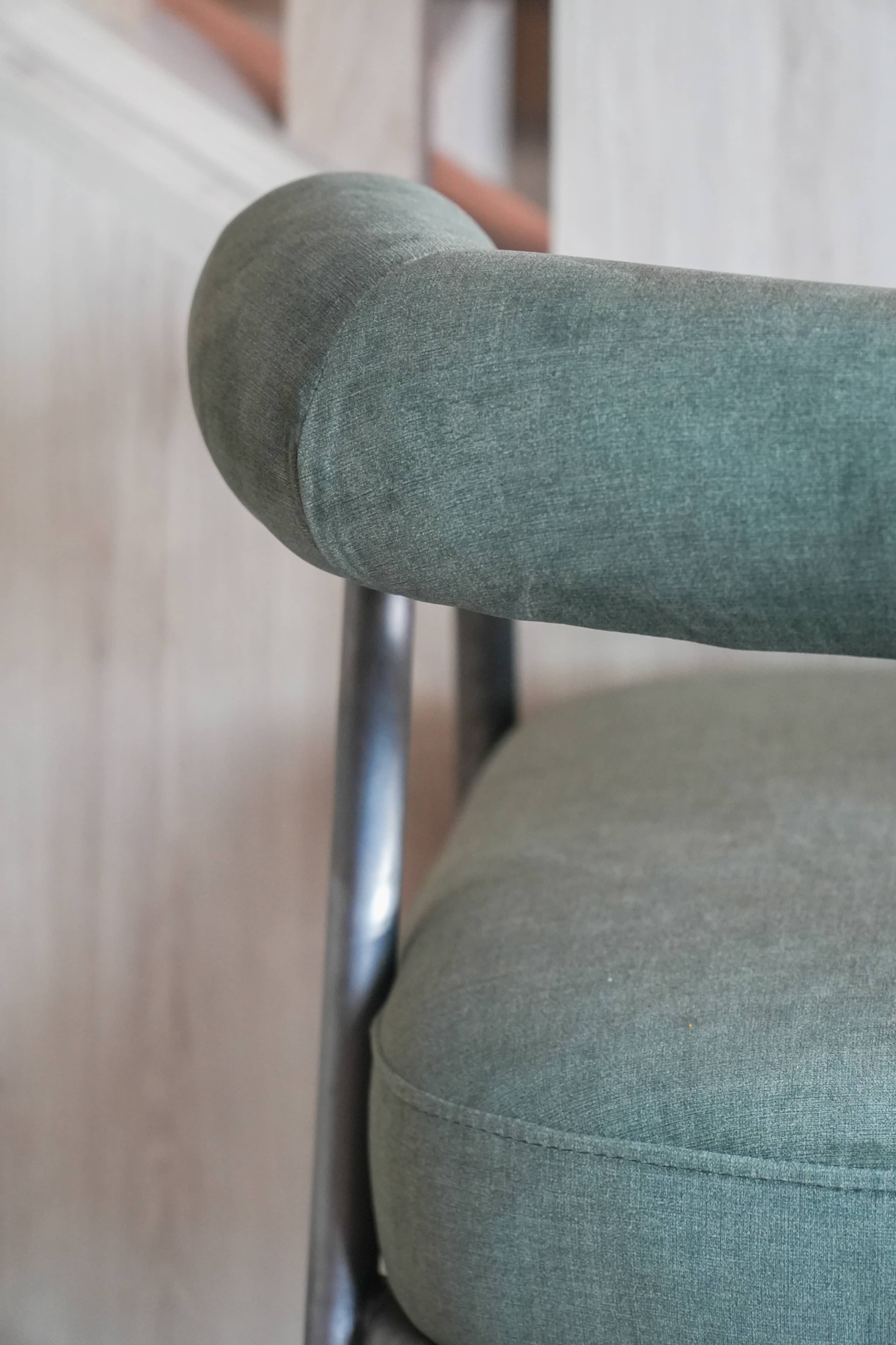 Rivius Verde là một phiên bản mang chiều sâu thị giác và cảm giác ấm áp hơn so với mẫu bouclé trắng nguyên bản. Lưng và tay vịn được thiết kế theo dạng trụ bọc vải, uốn cong tinh tế để tạo nên dáng ghế mở và đón người ngồi. Ghế được bọc vải linen hoặc canvas màu xanh ô liu dịu mắt, mang lại nét sang trọng nền nã và một cảm giác chạm đầy tự nhiên. Phần khung kim loại sơn tĩnh điện màu đồng xám nhám giúp tổng thể giữ được nét hiện đại mà không làm mất đi cảm xúc thủ công.