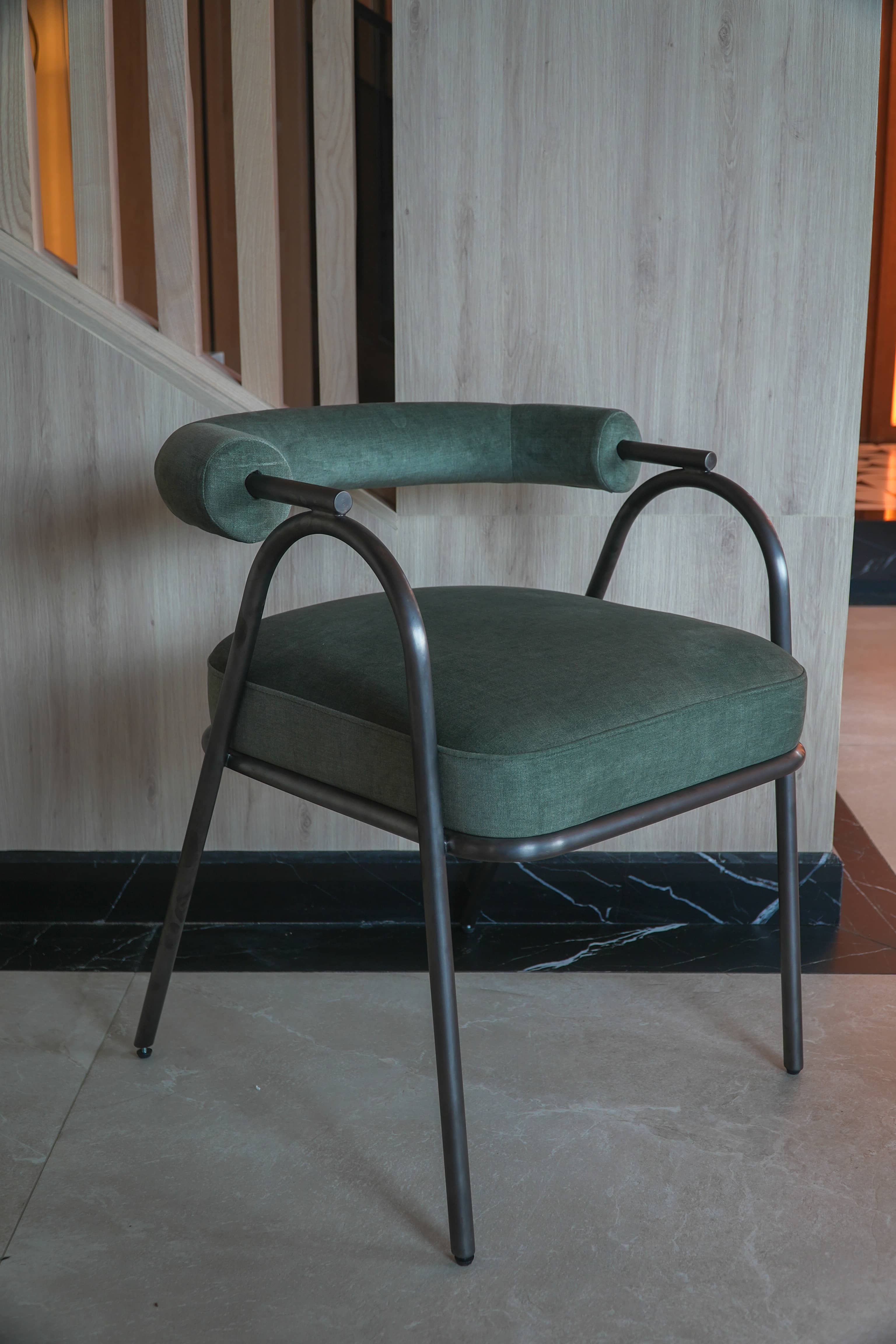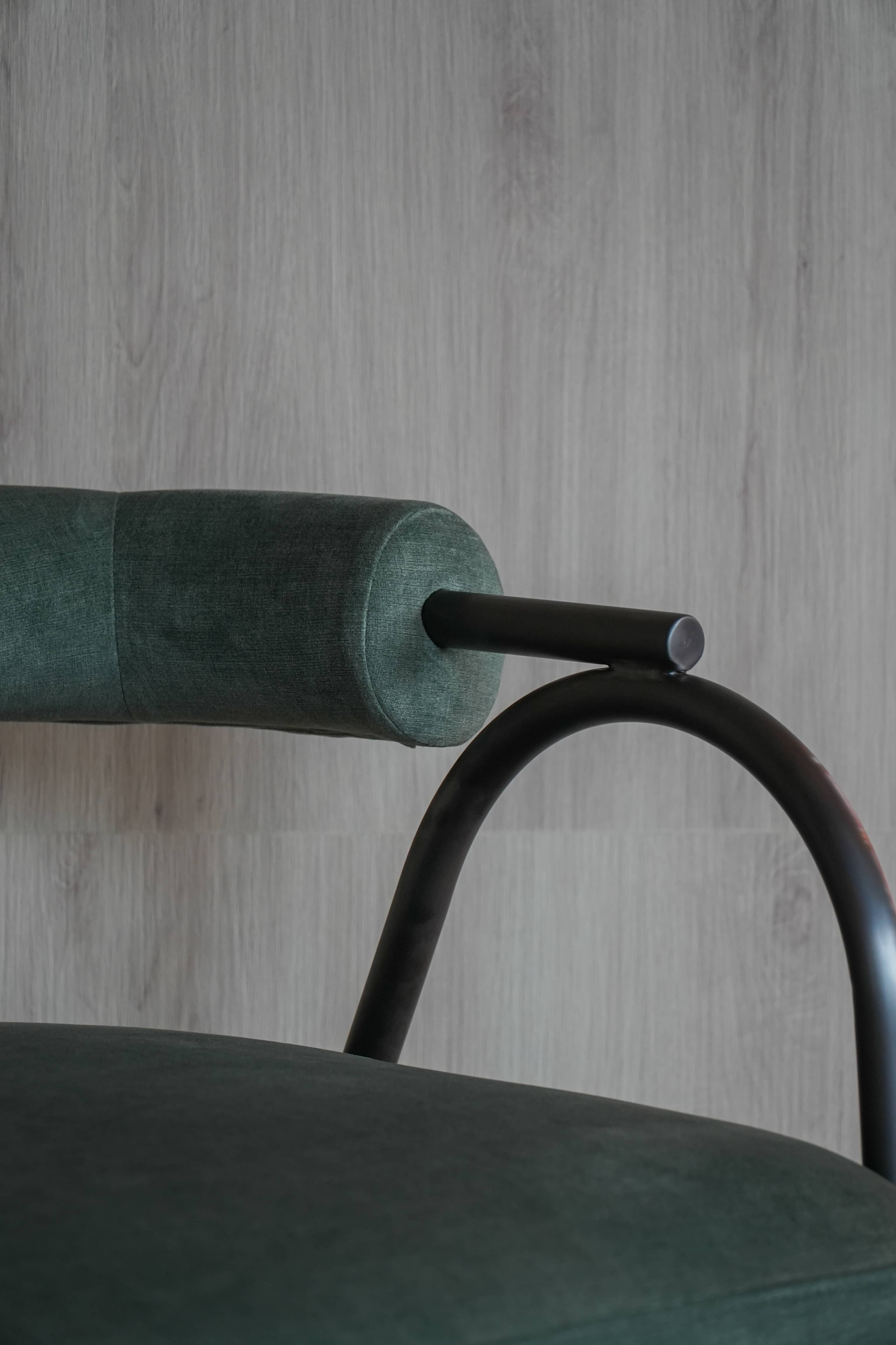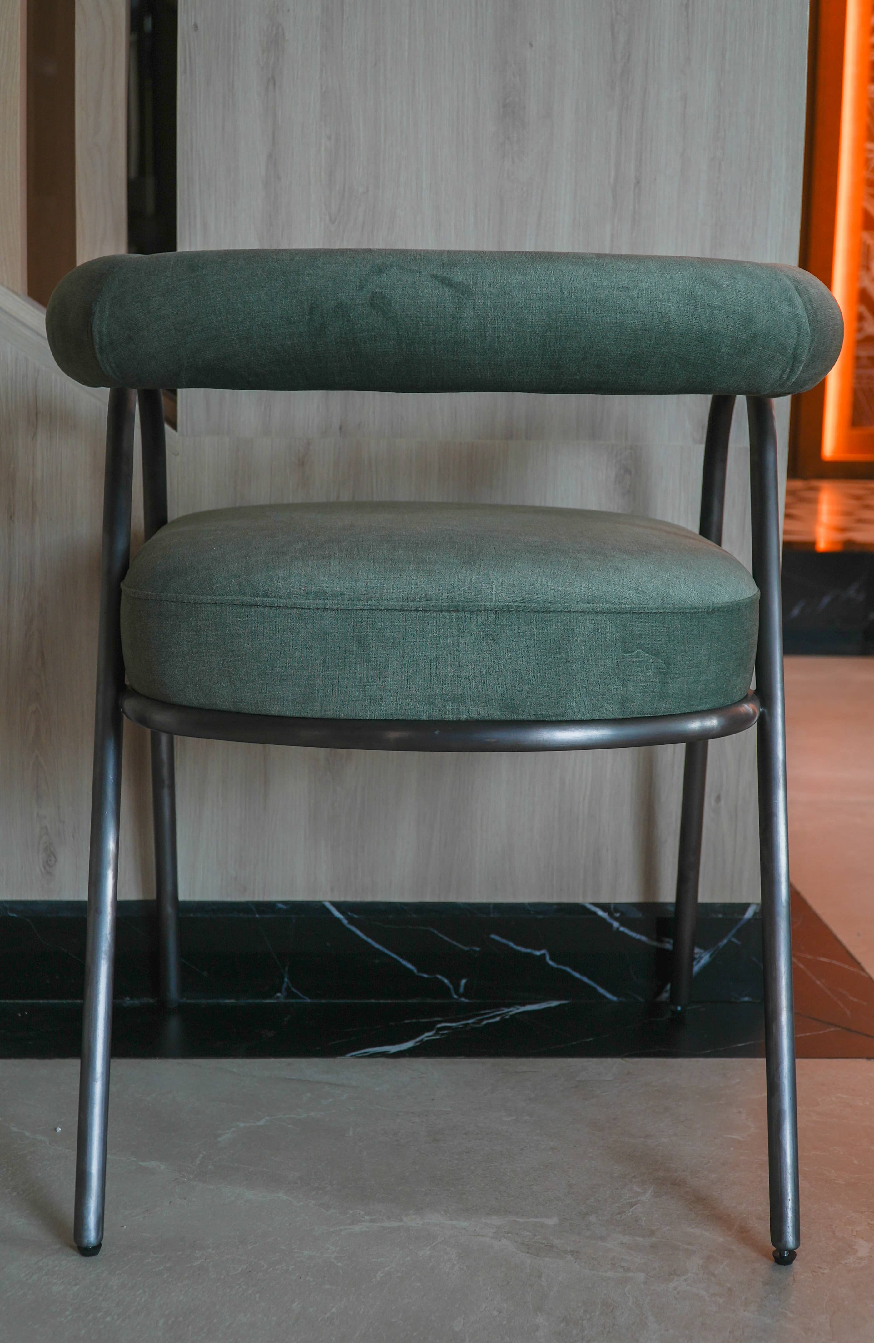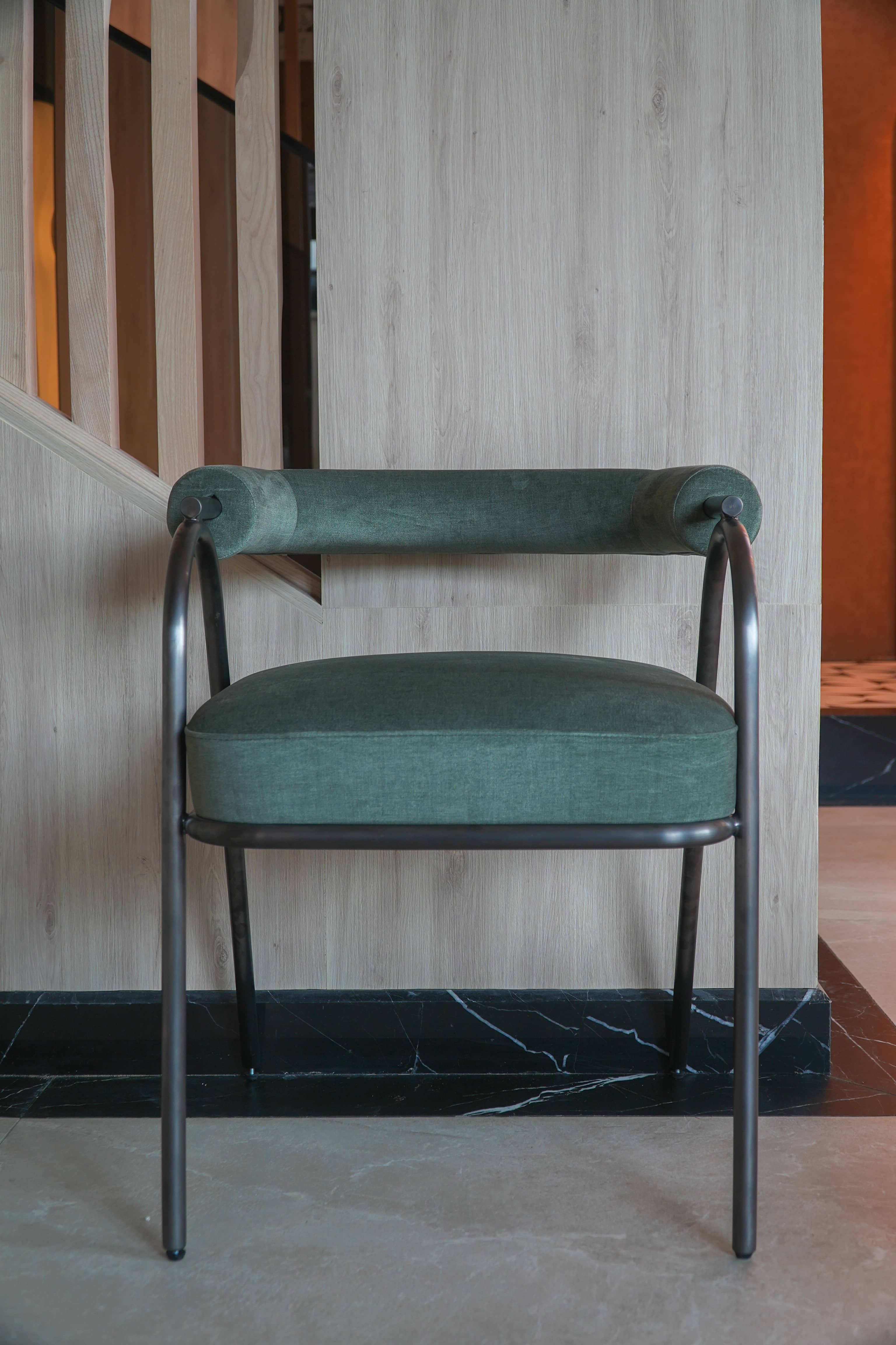 Rivius Verde là một phiên bản mang chiều sâu thị giác và cảm giác ấm áp hơn so với mẫu bouclé trắng nguyên bản. Lưng và tay vịn được thiết kế theo dạng trụ bọc vải, uốn cong tinh tế để tạo nên dáng ghế mở và đón người ngồi. Ghế được bọc vải linen hoặc canvas màu xanh ô liu dịu mắt, mang lại nét sang trọng nền nã và một cảm giác chạm đầy tự nhiên. Phần khung kim loại sơn tĩnh điện màu đồng xám nhám giúp tổng thể giữ được nét hiện đại mà không làm mất đi cảm xúc thủ công.
